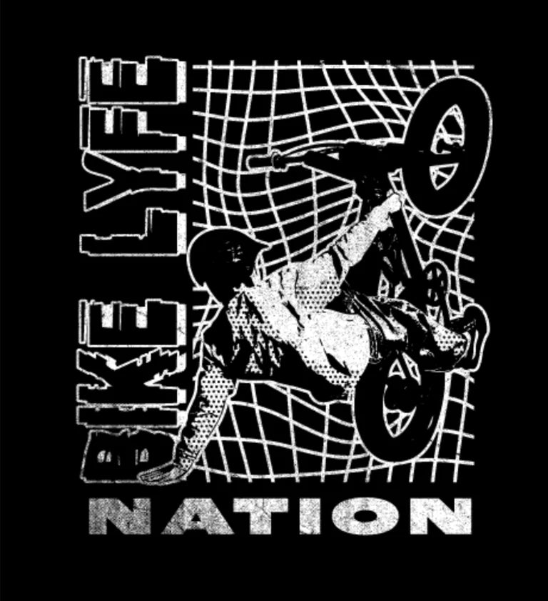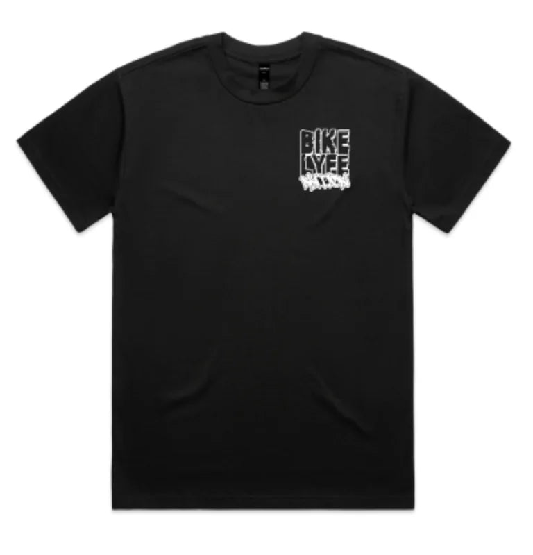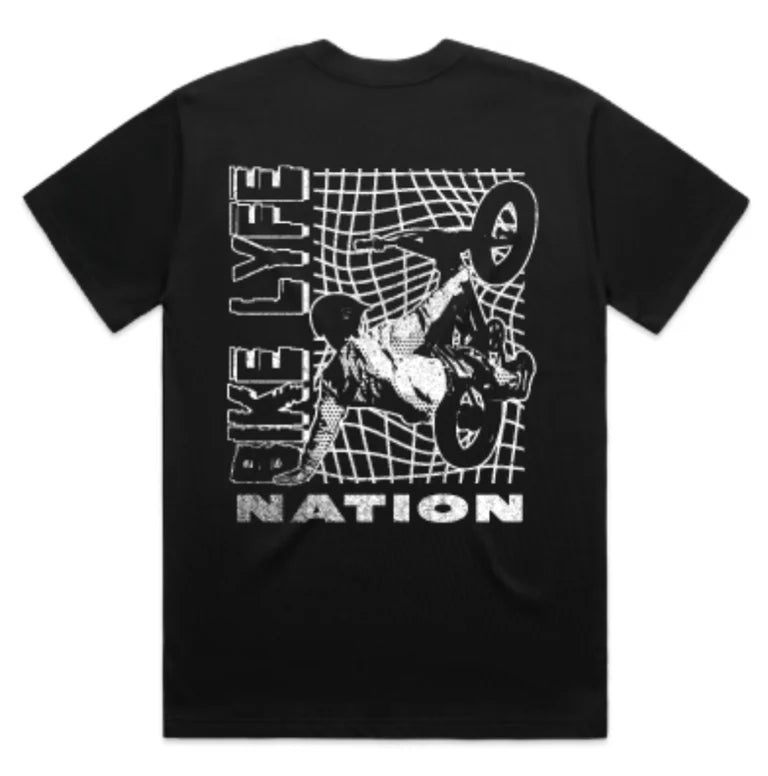 Bike Lyfe Nation Essentials Tee. Graphic screened at left chest. Large graphic on back. Crew neck. Short sleeve. 100% Cotton. Machine wash.