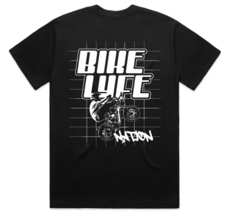Bike Lyfe Nation Essentials Tee. Graphic screened at left chest. Large graphic on back. Crew neck. Short sleeve. 100% Cotton. Machine wash.